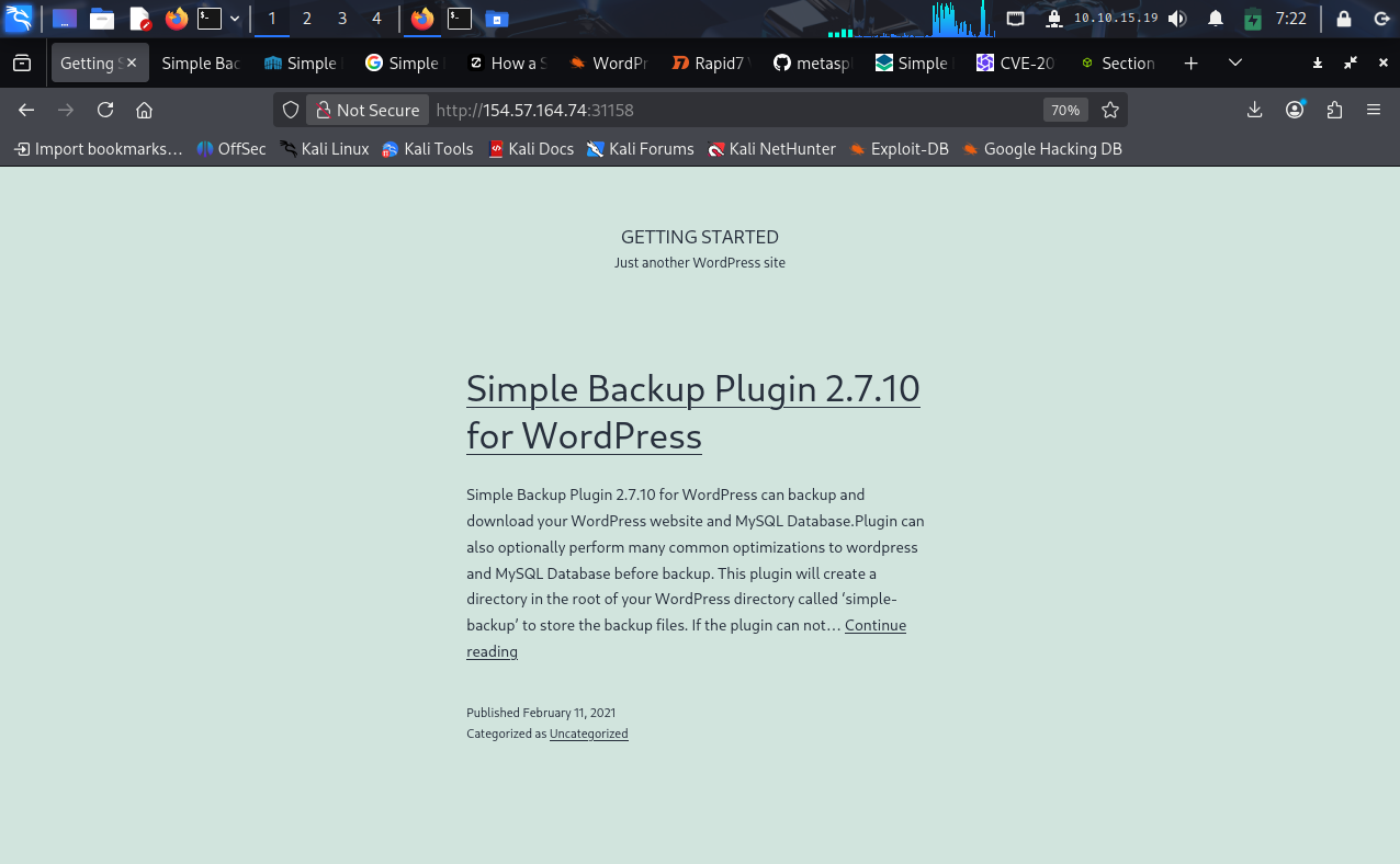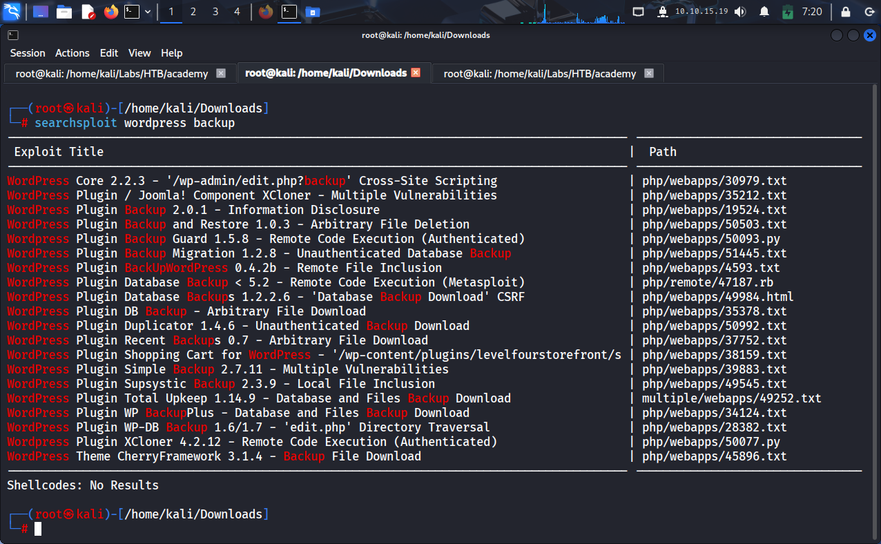 searchsploit returns multiple WordPress backup plugin vulnerabilities